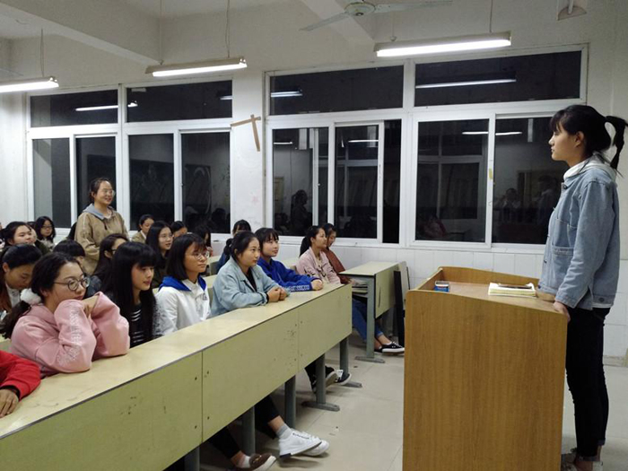 另一边,2017级语文教育班也在积极的开展班会活动。王丰元同学结合党的十九大,讲述了习近平总书记知青时期的艰苦生活和成长经历,这些都是当代青年树立正确人生观、励志成才的鲜活教材。2017级学前教育(3)班的鲍夏凡则哽咽着为同学们分享了自己身边的故事,她的初中班主任,她希望自己能成为一个像初中班主任那样让同学甜到心里的老师。话音刚落,大家便为她送上了热烈的掌声表示祝福和鼓励。