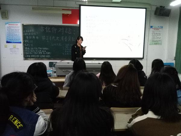 无独有偶,走进该系部2017级市场营销(1)班,该班级心理委员丁莉就《毛泽东思想与中国特色社会主义理论体系概论》这本书中的内容与同学们分享自己的心得并简要向同学们介绍党的十八大五年以来的历史性变革。接着,她以“新的发展阶段同样不能脱离社会主义初级阶段这一基本国情。”的论点深入进一步说明。台下的同学们认真聆听她的讲述,不时提出疑问,丁莉也耐心给予解答。