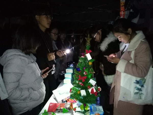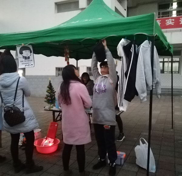 夜晚天气降温,为方便来往的同学挑选商品。该系部负责人打亮手机灯照亮桌子上的物品。