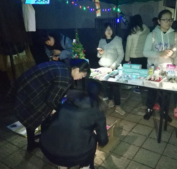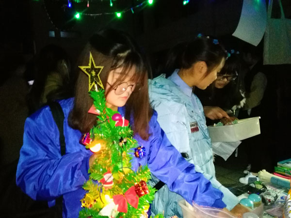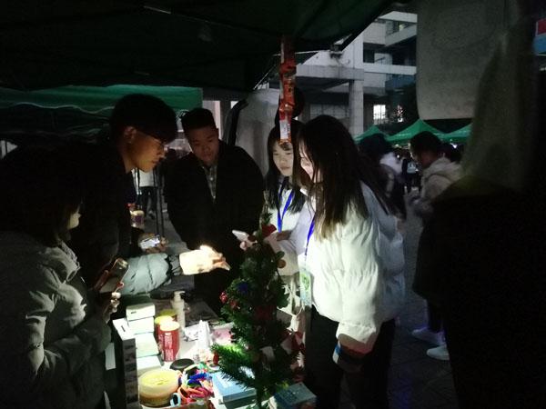 活动开始前,各班同学早早的来到场地布置小摊,绚烂的彩灯、琳琅满目的商品……顿时,精心布置后的摊点给校园的夜晚平添了一丝欢闹。