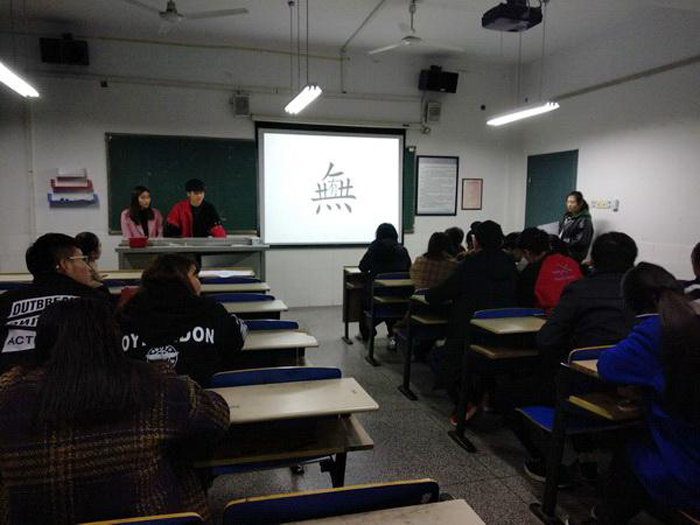 本网讯 为弘扬汉字文化,振兴汉字国粹,激发大学生对汉字的兴趣,领略汉字的精髓,11月27日晚,艺术设计系在丹青楼304教室举办了汉字英雄大赛。辅导员王昀应邀担任评委嘉宾。