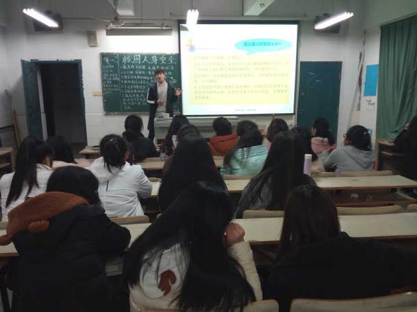 晚7时,随着上课铃声响起,班会正式拉开帷幕。当走进该系部2017级市场营销(1)班,该班班长何奇采用播放PPT的形式向同学们讲述了校园周边的安全隐患和安全常识。“如果大家遇到有人打架应该怎么办?”何奇问道。“直接忽视”“了解事情情况……”大家七嘴八舌的讨论起来。最后,他总结道:“首先要不围观,不起哄,不参与,如果遇到校外人员寻衅滋事殴打学生应立即向保卫部门报告或拨110报警。同学们都要注意,千万不要参与其中。”