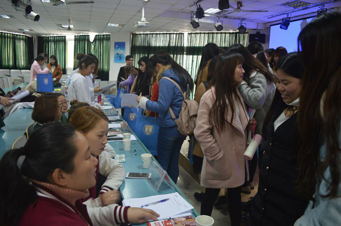 中午12:00,校大阶梯教室一人声鼎沸,来自华幼教育集团马鞍山本吉的堡幼儿园和北京马承英语宣城分校两家单位正在进行招聘宣讲,该系部2018届全体毕业生参加了本次专场招聘会。