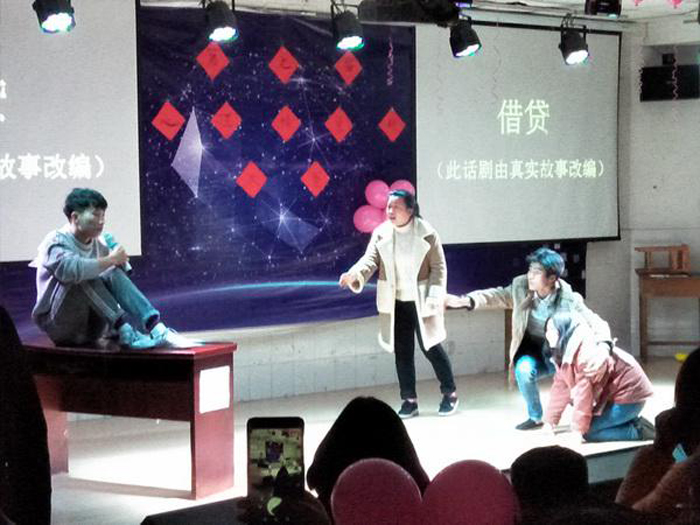 此次比赛分为自我介绍和作品演出两个环节,艺术设计系代表队展示的作品《借贷》由真实的校园故事所改编,讲述了一位大学生在校园里为了面子借高利贷,因无力还贷惨遭黑社会威胁与殴打,被迫选择结束自己的生命。他的父母为了讨回公道四处奔走申诉,最终沉冤得雪把黑社会势力绳之以法。