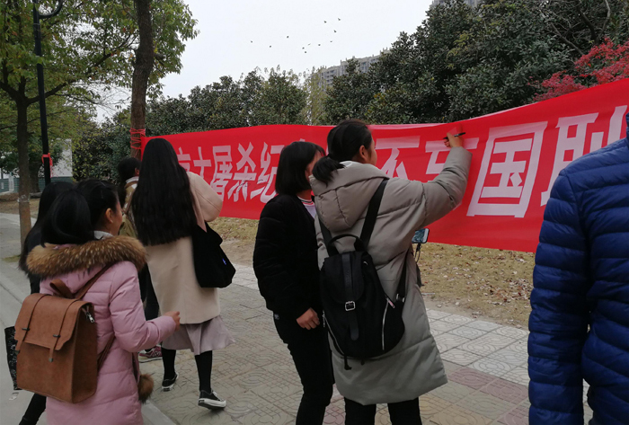 中午11点半,校学生会成员在食堂门口举行了“不忘国耻,自强不息”签名活动。过往的学生纷纷拿起笔在横幅上签上自己的名字,表达对遇难同胞的哀思以及对和平的珍惜。来自经济与社会管理系的彭传雨表示,此次的活动,让他更深刻的认识到了和平的珍贵。同时,也因为南京大屠杀的这段历史,心情无比沉重。在校园主干道两旁的樟树上,挂满了一张张同学们亲手制作的小卡片,上面写满了学校学生对南京大屠杀的感想,用无声的语言缅怀遇难同胞和抗日期间牺牲的英烈。