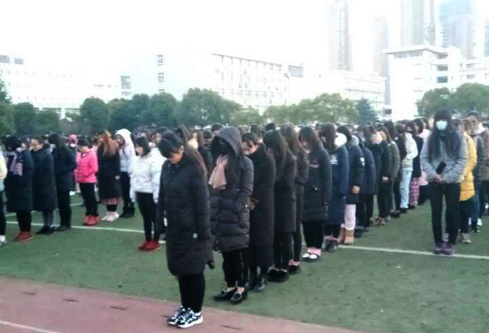 上午10点整,整个校园响起了低沉的警报声,正在教室、田径场、剧场、练功房、车间等场馆上课、排练的师生们,由授课老师下达“全体起立,集体默哀”口令,师生原地默哀一分钟;在办公室工作的教职员工,以及在图书馆和教室自习的学生,听到警报声立即起立,原地默哀;正在校园内行走的教职员工和学生,听到警报声立即停步,原地默哀;正在校园中行驶的机动车停驶鸣笛致哀一分钟。