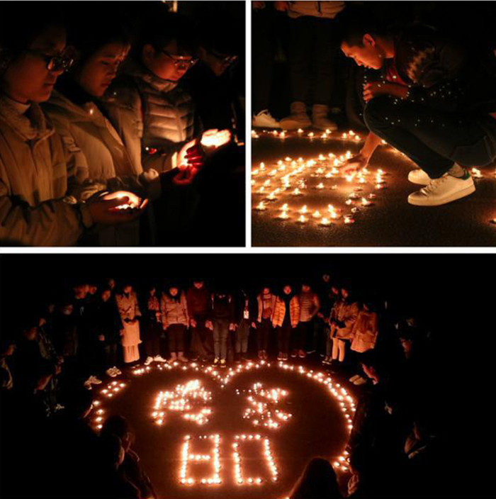 当晚六点,校学生会在操场组织开展“烛光祭”活动。学生会的成员点起了白色香烛,并用一个个蜡烛拼成了“南京,80”字样。随后,成员们手捧蜡烛,为南京大屠杀的遇难同胞默哀祈福。