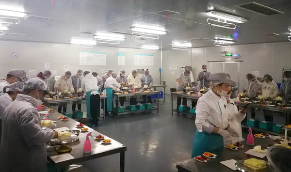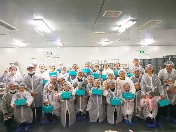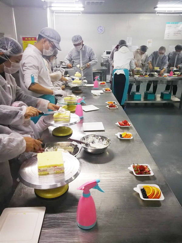 按照厂区的规定,参加活动的老师和孩子们穿戴上无菌护衣、鞋套、发套等,依次进行了严格的消毒吹淋,然后才进入无菌车间。工作人员带领大家参观了工厂的生产流水线,让大家对糕点、甜品等生产流程有了初步认识。来到蛋糕制作车间,工作人员详细讲解今天蛋糕DIY的工具、步骤,现场进行了演示并指导大家逐步操作直至完成制作。