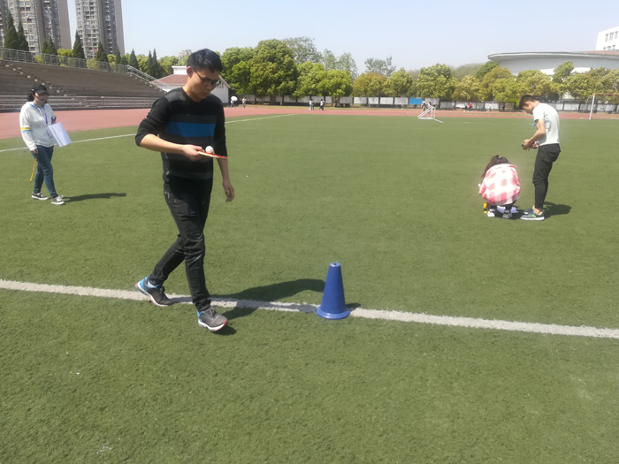 “乒乓球原地旋转五圈过障碍运输”比赛以个人为单位,分五组进行预赛,预赛中小组前俩名进入决赛。来自该系部2017级市场营销(2)班张梦飞在比赛中就地旋转五圈后,眩晕感使得他左右摇晃,引得现场的同学忍俊不禁。随后,他快速调整,开始平稳地运输乒乓球,成功经过各个障碍物,他小心翼翼地运输防止乒乓球掉落,他认真的态度得到同学们的认可。