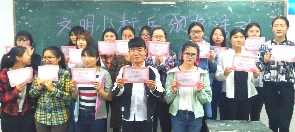 本网讯 为了树立文明模范,食品工程系学生会心理健康部和文体部联合组织开展“校园文明小标兵”评选活动,通过各班级民主推选出校园文明小标兵,4月11日,于E106举办“校园文明小标兵”颁奖仪式。