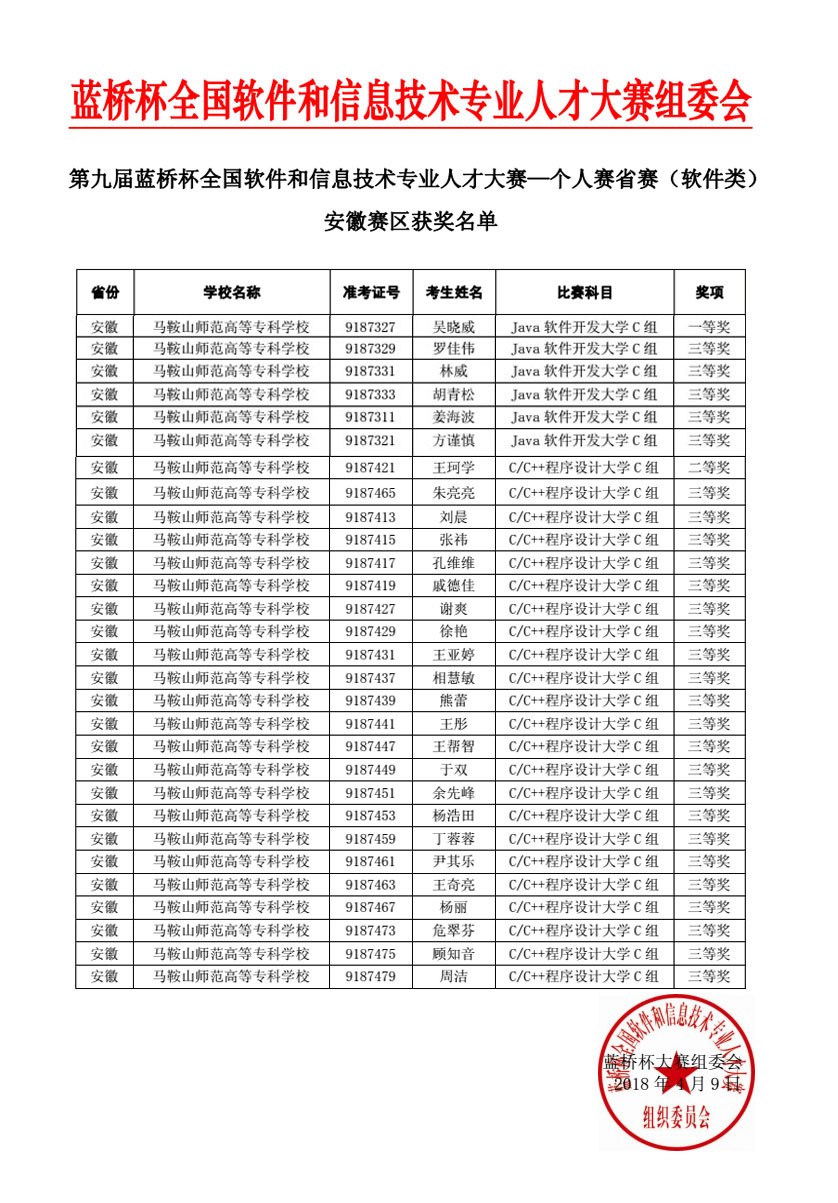 本网讯 4月9日,喜报传来,马鞍山师范高等专科学校软件工程系在由教育部高等学校计算机科学与技术教学指导委员会、工业和信息化部人才交流中心共同主办的“全国软件专业人才设计与创业大赛”暨第九届蓝桥杯大赛省赛中取得优异成绩,学校软件工程系(软件与互联网学院)29名同学获奖,1名同学进入国赛。