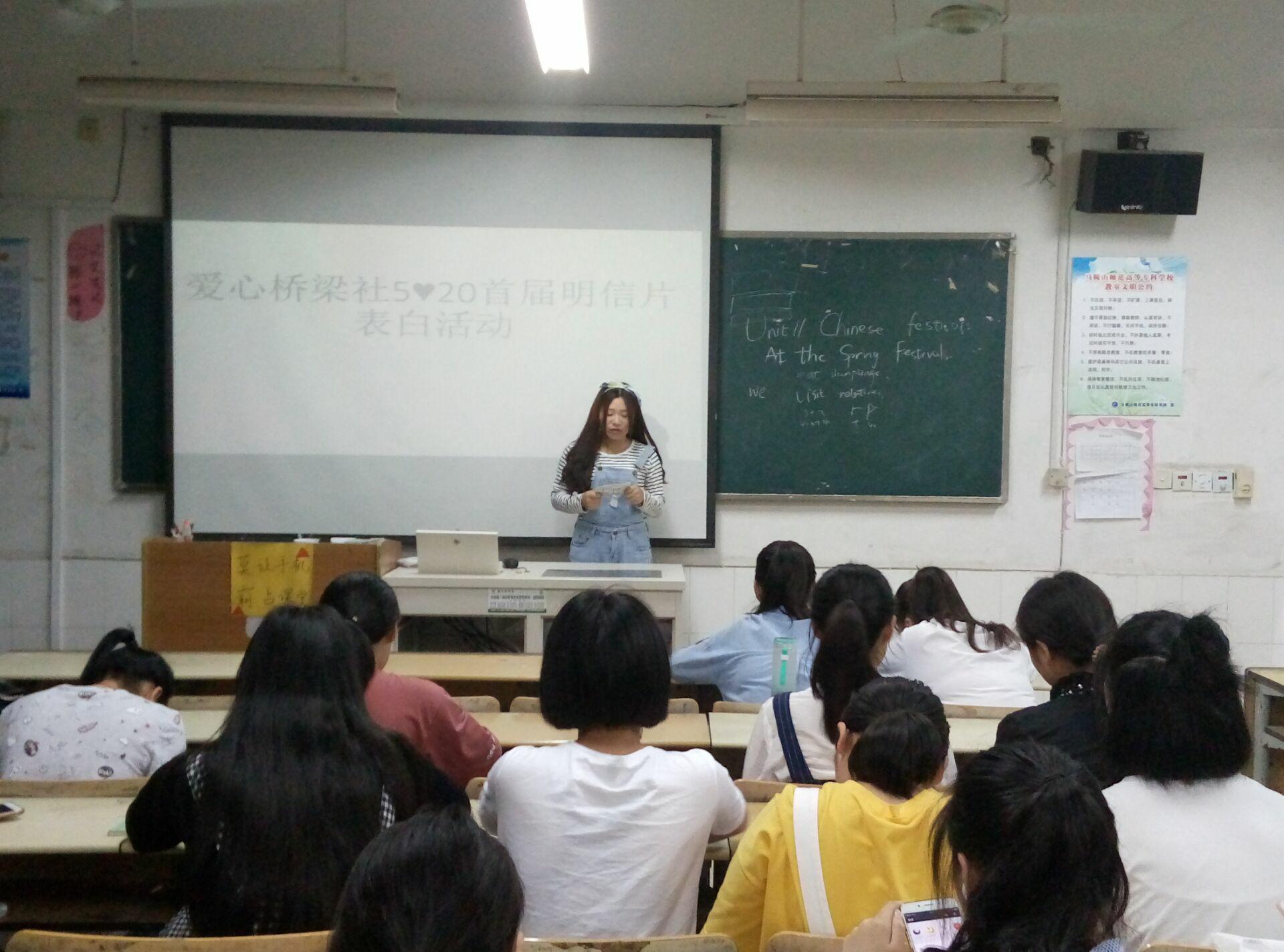 即日下午13:00,该社团成员们陆续到达活动现场。活动伊始,该社团策划部干事蒋伟利用多媒体设备播放了一组以“爱”为主题的感人画面。视频中有羊妈妈失去了孩子而痛苦的漫画;也有儿女与父母面对面的交谈、相互拥抱而的情景;还有受伤的父亲,在生命最后一刻扔不忘保护自己孩子的画面……随着时间的流逝,同学们安静地观看着,感悟着其中传递的情感,许多成员甚至禁不住抬起手来擦拭眼泪。来自2017级应用英语2班的张钰同学表示:“希望时光能够走得更慢一些,好让自己多些时间陪伴家人。”简短的影片结束后,同学们纷纷上台交流了自己在观看中的感悟,并若有所思地在明信片上写下自己想说的话,同大家分享了自己在明信片中表白的对象及原因。其中,该社团组织部干事洪雨萱表示,她要表白的对象是她的家人,想借此机会对前不久生病的爷爷表白,希望爷爷身体健康、早日康复。无独有偶,有的同学表白父母,想说一声“我爱你”;有的同学表白未来的自己,希望自己越来越好;有的则表白未来的Mr Right,承诺会好好爱自己;也有的表白好闺蜜,相信“时光不老,我们不散”。