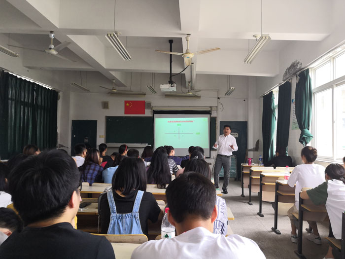 本网讯 为了加强大学生对就业的重视,帮助同学们树立正确的就业观。9月26日,经济与社会管理系(思政部)团总支于博学楼601组织开展了大学生就业指导培训讲座。此次讲座由特聘讲师王靖原担任主讲,该系部2016级市场营销(3)班全体学生参加。