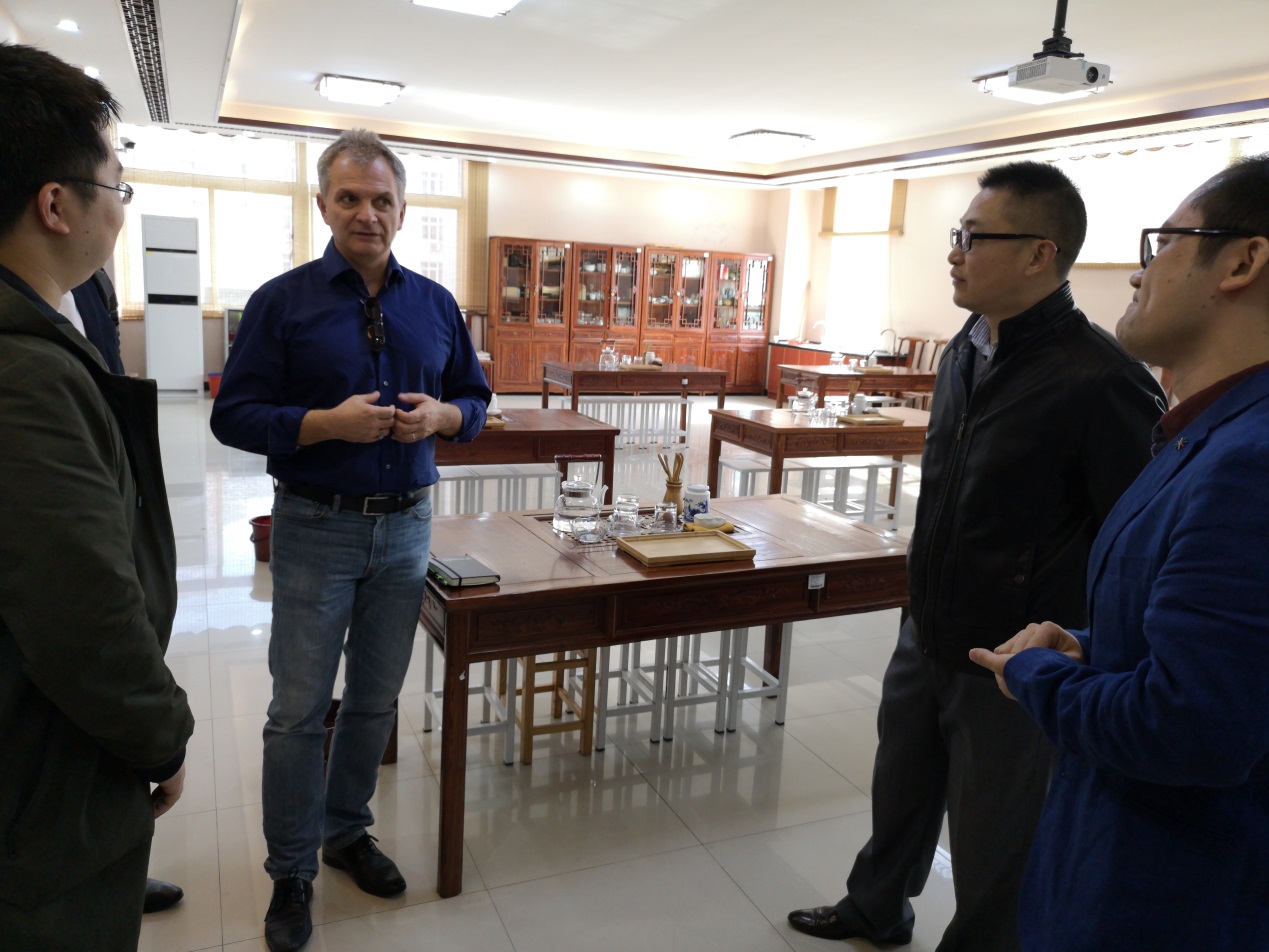 座谈会结束后,施魏乐博士一行在王结贵等的陪同下,参观了学校茶艺实训室、中西餐实训室、韩语情景实训室、商务会展实训室等,王结贵提出,实训室是根据学生课程设置而创设,对学生进行实践操作技能训练,是培养学生专业领域实际工作的基本能力、基本技能以及职业素质的必要过程。学生可以通过实训室学习中国茶文化、中西餐餐具摆放,利用VR技术进行韩语情景交流、运用软件进行网上交易,并详细介绍了各实训室的功能、学生实训技能考试等方面的情况。(文/青春通讯社记者章玉洁 许婵娟 组稿/新闻中心实习记者朱雪雯 编辑/黄凌骜 审核/刁山嵘)