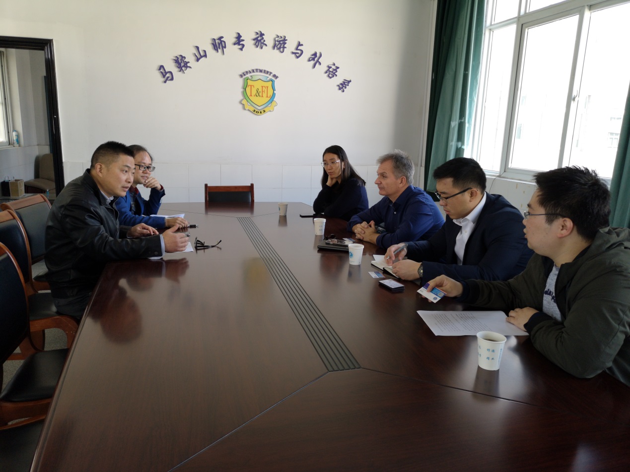 本网讯 10月29日上午,德国凯撒斯劳滕市与地区经济促进发展有限责任公司(市政府经济发展部门)总裁博士施魏乐、项目经理欧耀民一行,在马鞍山市人民政府外事(侨务、港澳事务)办公室科长蒋燕,曲绍波的引荐下访问了马鞍山师范高等专科学校。旅游与外语系主任王结贵,系分管教学副主任王德军,国际交流合作中心刁山嵘热情接待了施魏乐一行。