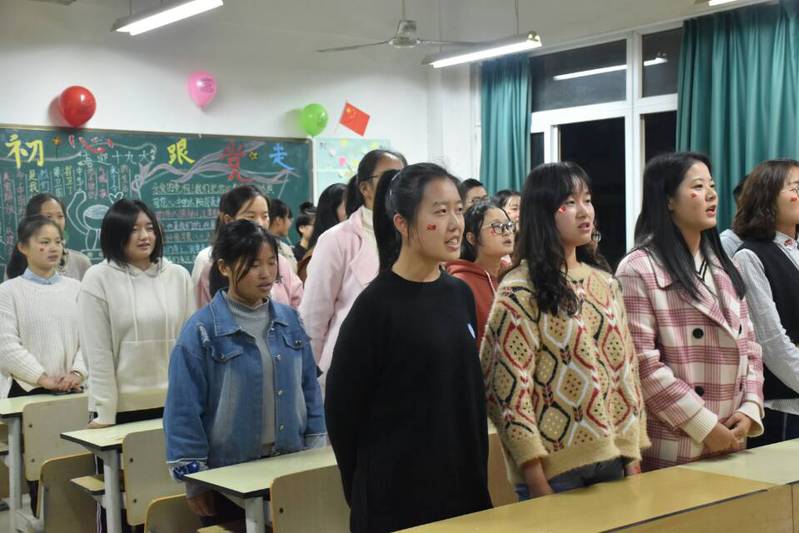 “国的家住在心里,家的国以和矗立,国是荣誉的毅力,家是幸福的洋溢……”走进教学区,远远听到嘹亮的歌声自教室传出,原来是2018级学前教育1班。进入班级,庄严肃穆感犹然而起,同学们正襟危坐,一边歌唱,一边做着整齐的手势,认真的表情、端庄的姿态让人不觉为之一震。再看向教室后面的黑板报,鲜红的党旗飘荡在黑板中央, 24字社会主义核心价值观镶嵌其中,简单的设计,主题突出,给人以强烈的视觉冲击力。走进2018级英语教育1班,全体同学正在进行着慷慨激昂的宣誓。铿锵有力的声音,代表着那一颗颗“不忘初心跟党走”的恒心,更体现着同学们向“青春建功新时代”努力的决心。宣誓完毕后,同学们以集体合唱《歌唱祖国》的形式表达了对党和祖国的热爱。2018级数学教育班,虽没有轰轰烈烈的氛围,也没有激昂高亢的歌声,他们在主持人的带领下,以PPT展示的形式共同讨论了“当代青年应该树立什么大志”的问题,直奔主题。活动中,同学们态度端正,积极认真,气氛活跃融洽,参与度高。
