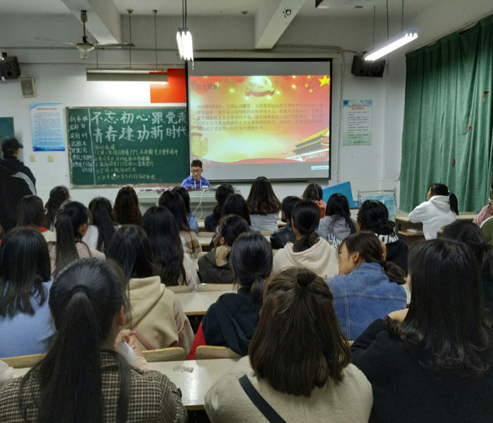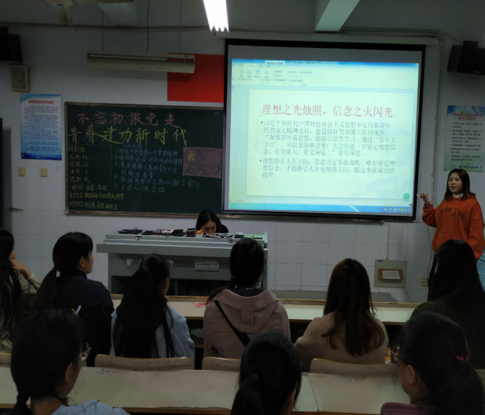 晚7时许,各班班会拉开帷幕。来自该系部2018级新闻采编与制作班班长江正,用PPT帮助同学们更直观地了解此次班会的意义。他就新中国的历史背景及今日辉煌为同学们详细讲解。点明了从五四运动、改革开放时期至今,党和国家无时无刻不在顽强抗争才成就了如今的新中国、新时代。他从党的指导思想、政治任务、工作方法三大方向具体阐述出新时代的新要求。在谈及大学生应当如何做的问题时,他强调:“当代学生应做到爱国、立志、求真,立行。”并结合自身的学习和生活情况,与同学们展开深入讨论。