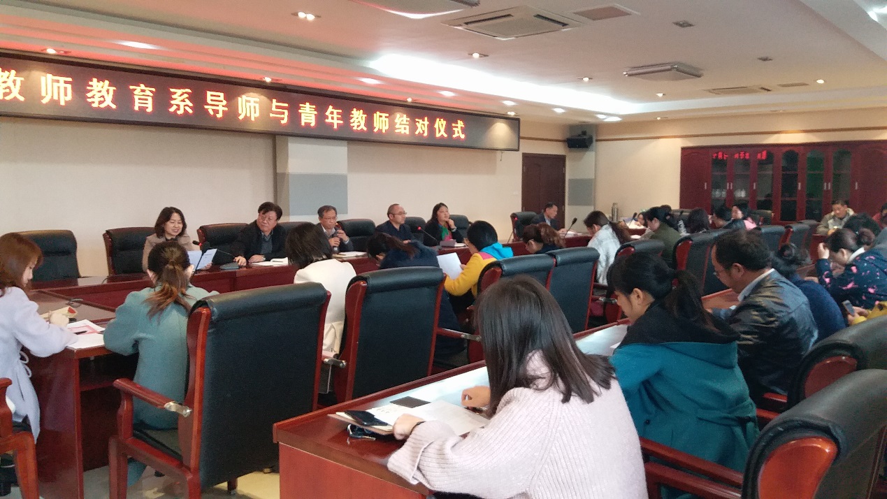 本网讯 为优化系部师资队伍,充分发挥老教师、骨干教师、专业带头人等优秀教师的“传、帮、带”作用,促进青年教师快速、健康成长,11月14日,教师教育系(基础部)于行政楼302会议室举办导师与青年教师结对仪式。参加此次仪式的有:校党委委员、纪委书记、工会主席吴志华,组织人事处处长张程刚,教师教育系主任秦东方、党总支副书记吴德琴、副主任王红艳,以及21组结对教师。仪式由秦东方主持。