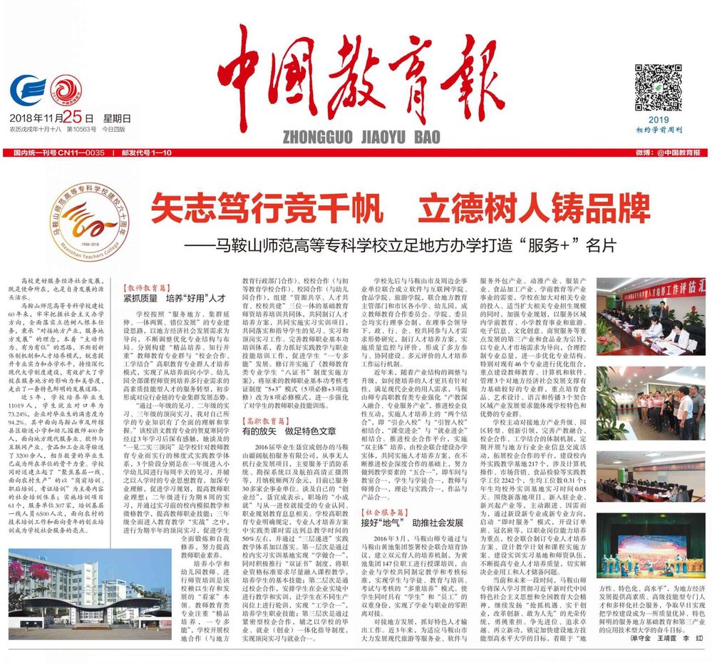 2018年是马鞍山师范高等专科学校建校60周年的时间节点,《中国教育报》在2018年11月25日第4版“教育展台”版面头条位置以《矢志笃行竞千帆 立德树人铸品牌——马鞍山师范高等专科学校立足地方办学打造“服务+”名片》为题,专题报道了学校建校60年来,牢牢把握社会主义办学方向,全面落实立德树人根本任务,立足地方办学推进“两个建设”、构建“美好师专”取得的成效。