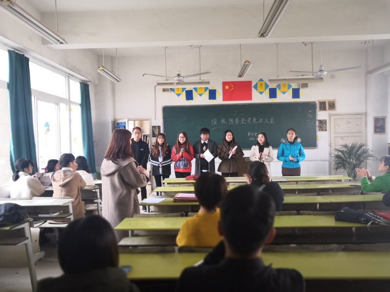会议伊始,闵玉荣对入党流程进行了再次强调,并对本次会议的主题和议程做了简要说明。随后,本次7名发展对象依次上台做思想汇报,从入党动机、生活、学习和工作几个方面介绍了近一年来的情况。大家真诚地表达了对党的向往与忠诚,承诺坚定不移跟党走,为共产党主义事业奋斗终生。入党介绍人分别对每位同学进行了客观评价,并提出要求。最后,与会正式党员结合政审和个人汇报情况,对接收预备党员情况进行了谈论和不记名投票表决,最终全数通过,符合程序规定。
