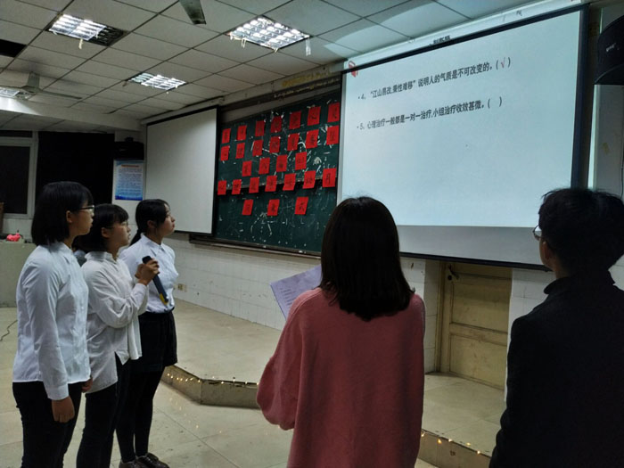 在知识问答环节中,面对有些偏僻的题目,她们毫不露怯,从容应答。在“精神分析理论认为造成抑郁的原因是什么?”一题中,廖莉莉凭借团队中的默契配合和自身丰富的心理知识常识,快速与团队商讨答案,冷静思考正确应答。选手们运筹帷幄,胸有成竹,体现出其自信乐观的良好心理状态。