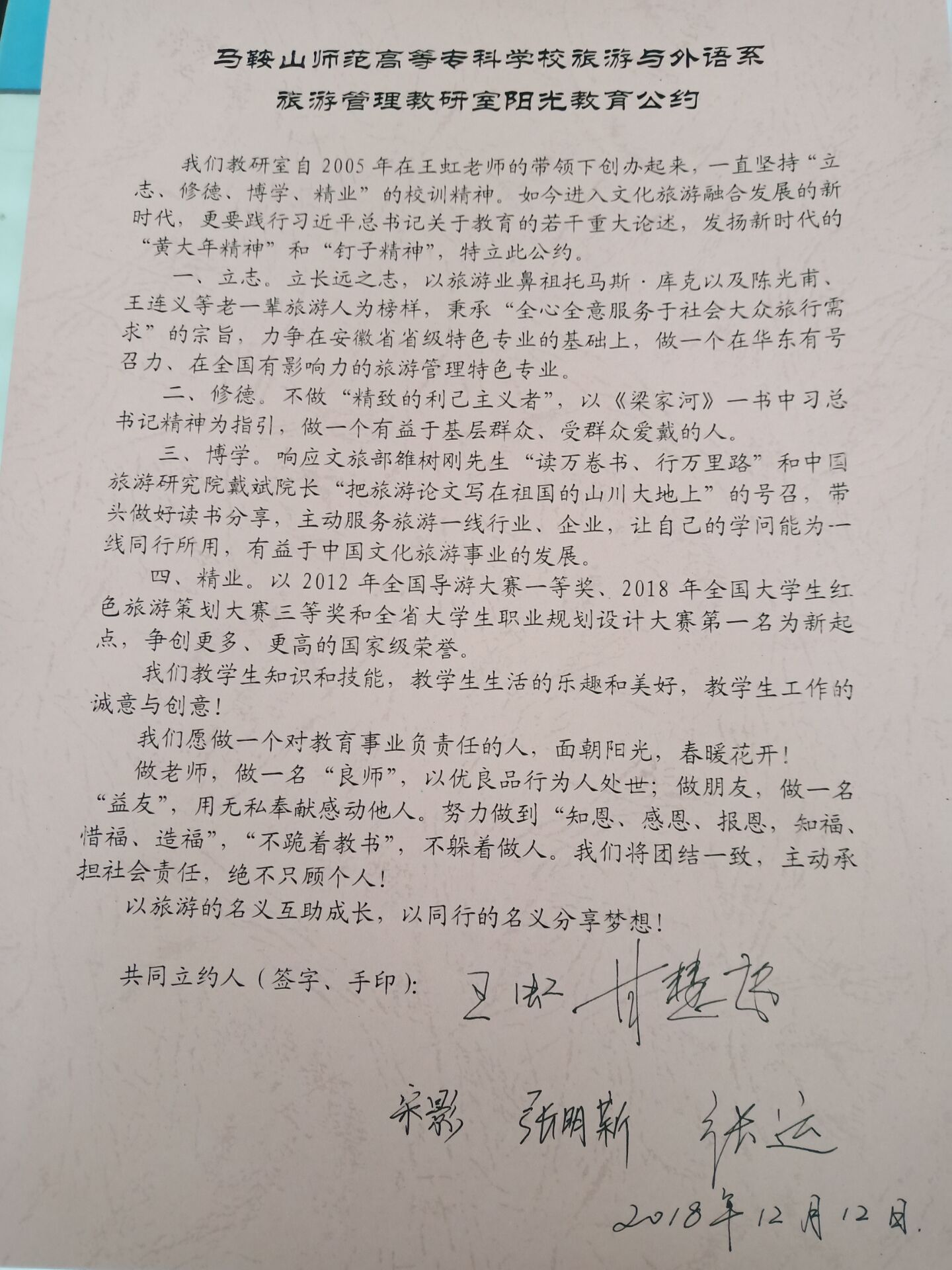本网讯 12月12日下午,旅游与外语系旅游管理教研室深入学习《新时代高校教师职业行为十项准则》,引导教研室全体教师“立长志,做良师”,并在此基础上结合专业发展特色,共同协商制定、签署了《旅游管理教研室阳光教育公约》。该系副主任王德军出席会议,招生就业指导办公室副主任晋愈飞应邀参加会议,旅游管理教研室主任张运主持会议。