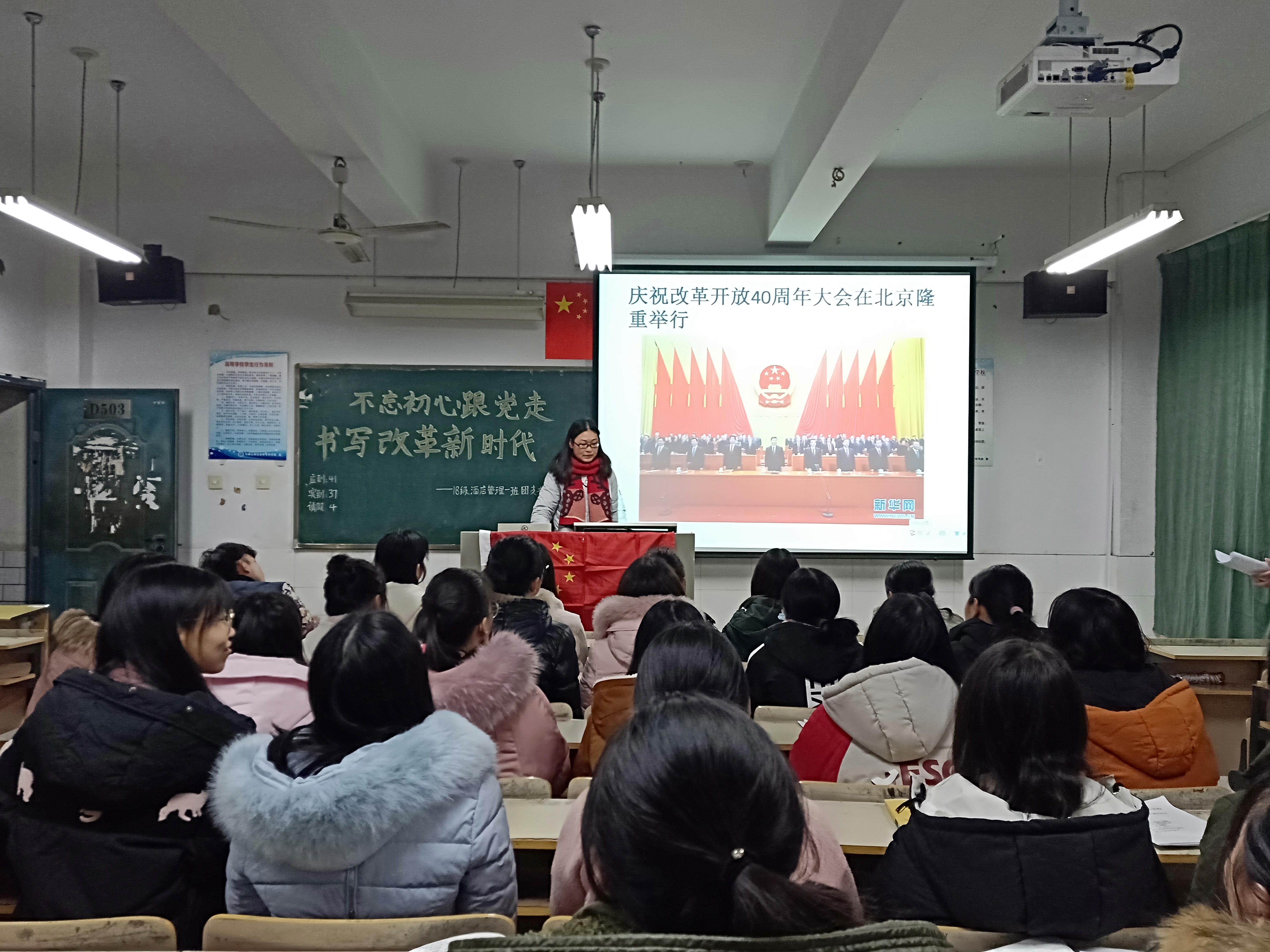 来自2018级旅游与外语系酒店管理1班的康虎,首先以PPT 的形式带领同学们观看了习近平总书记就改革开放四十周年系列讲话的相关视频。通过习近平总书记的讲话精神来帮助同学们重温改革开放四十年的艰辛历程,鼓励同学们脚踏实地,坚定理想信念,用自己的实际行动来报效祖国。来自18级旅游管理2班的蒋凯欣,则以主题演讲的方式着重向同学们介绍了改革开放四十周年精神。同时,还通过问题抢答的形式与同学们展开互动。这次的团日活动充分地让同学们体会到了习近平总书记在十九大报告中说道的“青年兴则国家兴,青年强则国家强”意的义所在。