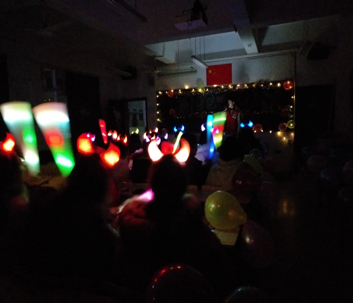 晚7时许,各班的晚会在欢呼声和音乐声中拉开序幕。“或许再见是该死的念头,说不出口,至少自尊没让我更难受,别再问候……”未见其人先闻其声,走进该系部2018级移动商务专业(2)班,该班正在进行男女对唱环节,段彬彬一开口就征服了台下的同学们,浑厚的嗓音,动听的旋律,闪烁的灯光和同学们的手中的荧光棒交相辉映,使全场的气氛迅速升温。同学们挥舞着手中的荧光棒,嘴中轻轻哼唱应和着,与歌声巧妙融合,将气氛推到高潮。