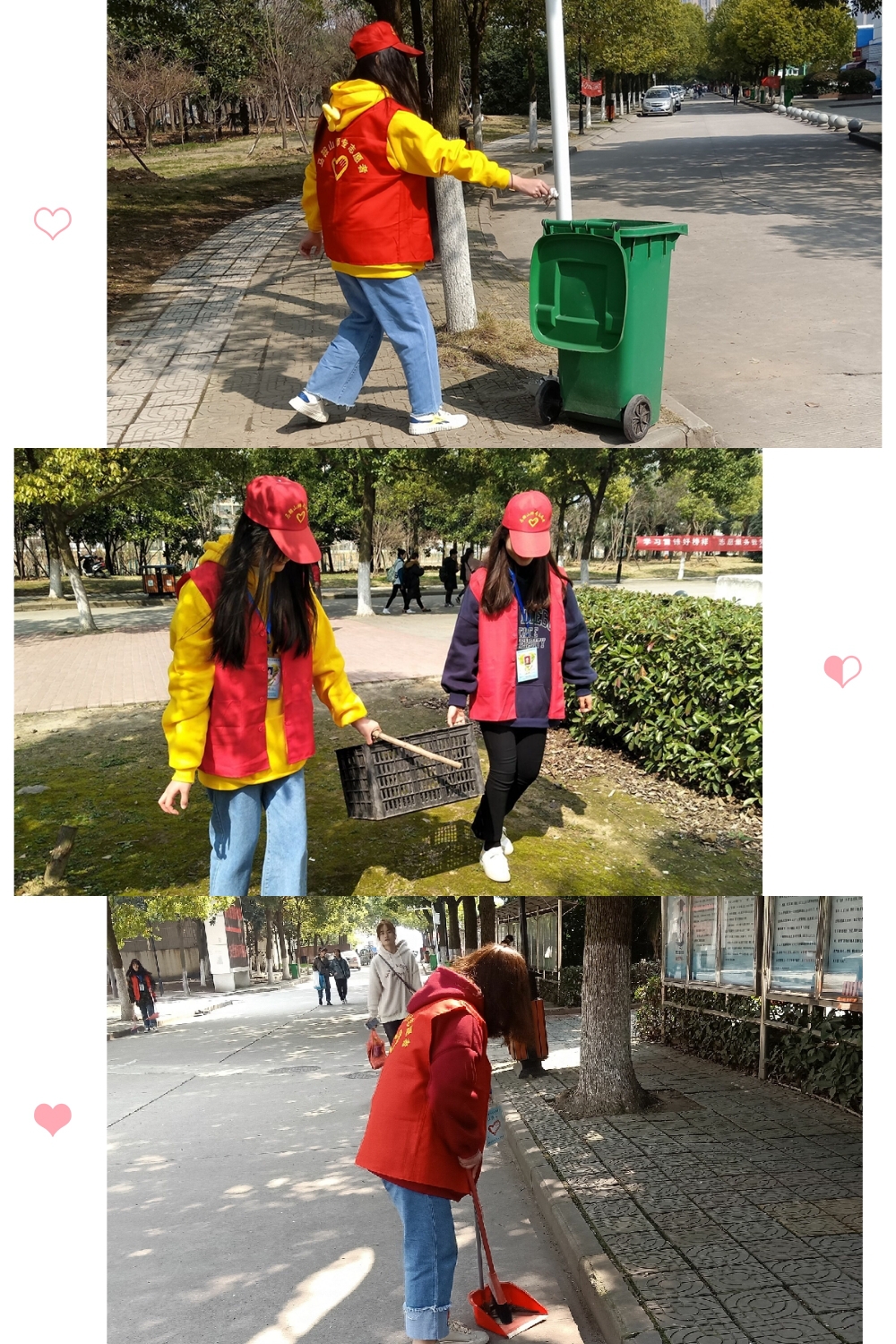 下午1时20分,志愿者们,在男生宿舍楼下集合。活动开始前,负责人将志愿者分为了四组,每组志愿者在分工明确之后,迅速到达各自安排的地点。志愿者们整齐地戴上小红帽,穿上红马甲,拿着打扫清洁的工具开展清洁活动。