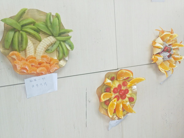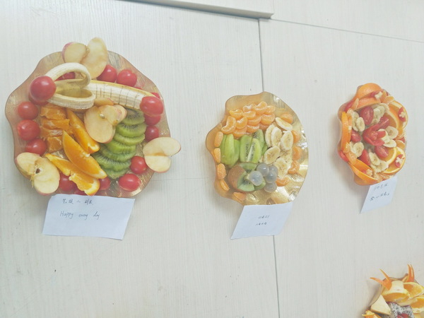 比赛现场果香四溢,热闹非凡。经过一轮紧张的制作,葡萄、菠萝、橘子、苹果、香蕉、草莓、圣女果等各式水果,在选手们的精心制作下被改造成不同形状,拼放成各种造型图案。作品色彩艳丽,造型新颖,创意无限。各班级代表还生动阐释了小组创意设计的理念:有提倡做自尊自强的现代女神设计,有向往阳光生活的极富朝气的“向阳花”设计,有放眼多元文化的热带风情沙滩椰子树设计,有充满爱心的“love”设计……。由学生会副主席和社会实践部男同学组成的评委团在6组作品中选出了最具创意和特色的作品,分别评出一、二、三等奖。