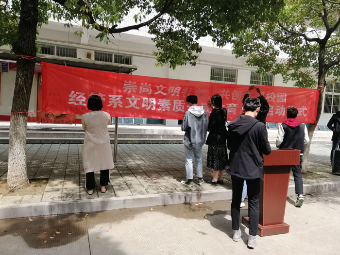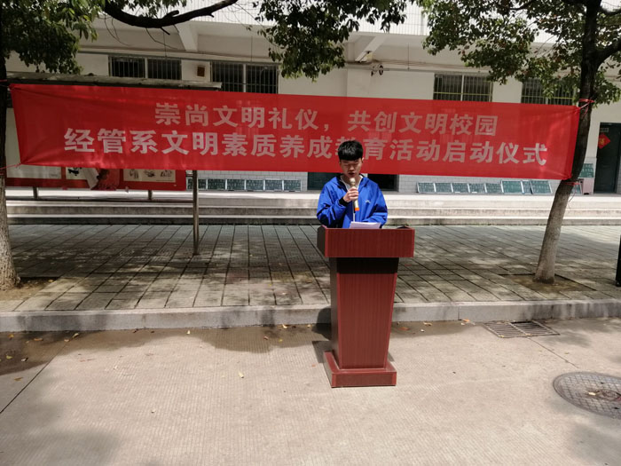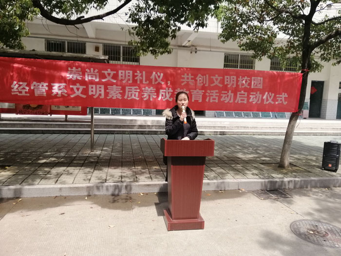 本网讯 为了使大学生养成良好的文明习惯,切实提高学生的综合素质和文明修养,促进优良学风建设。4月11日,经济与社会管理系(思政部)团总支于博学楼下开展大学生文明素质养成教育活动启动仪式。据悉,本次活动由该系部团总支书记欧阳文清作为启动人,2018级各班班长,入党积极分子和该系学生会干事共同参与。