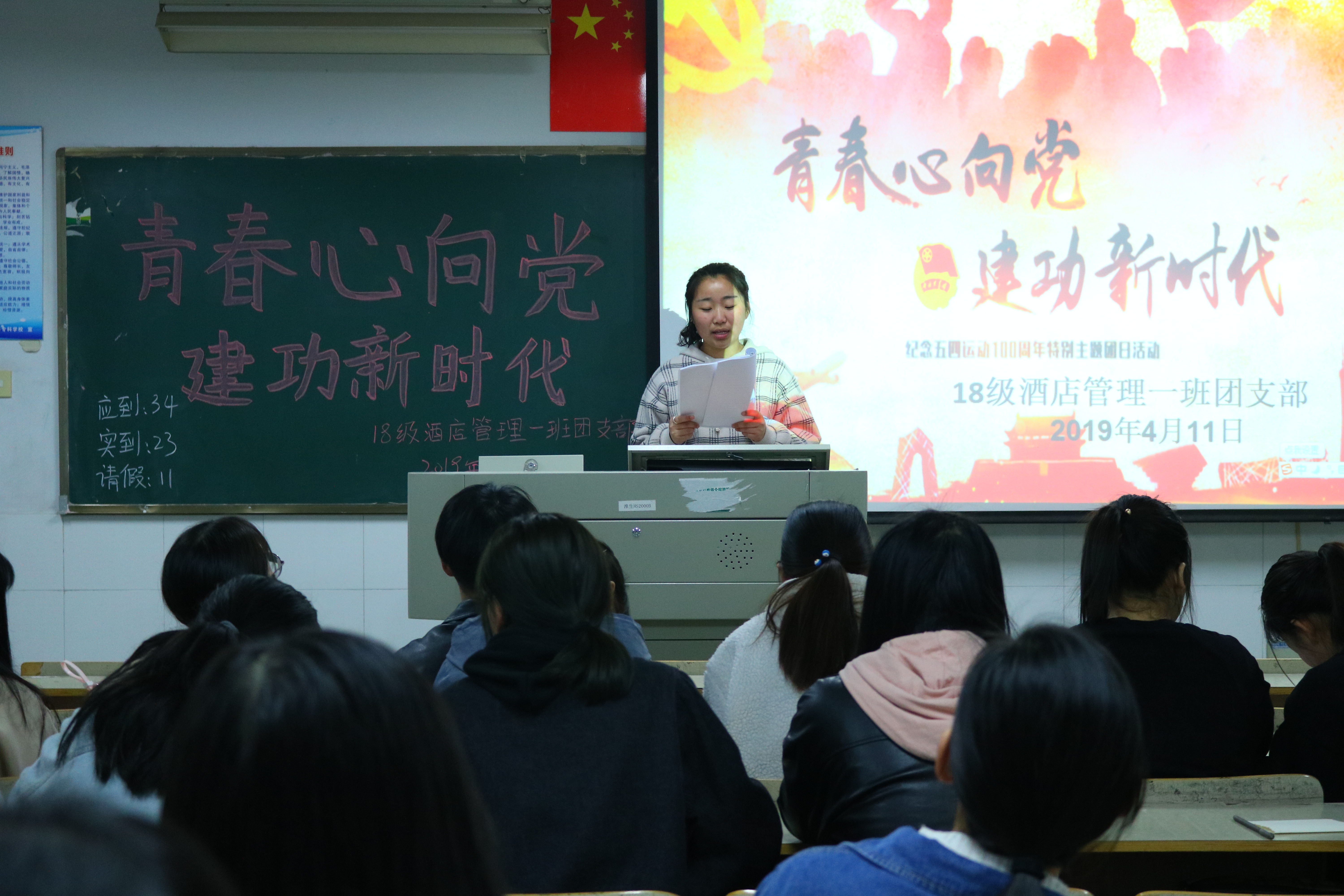 本次团日活动的主题紧跟党的十九大步伐,积极响应党的号召,纪念五四精神,使我校学生更加全面的了解习近平新时代中国特色社会主义思想。来自旅游与外语系酒店管理一班的秦紫琼通过精美的PPT、黑板报、演讲等形式让同学们充分认识到开展团日活动的意义。秦紫琼说:“青年是一个时代的化身和缩影,是一个时代精神和时代特征的鲜活体现。青年一代应积极学习贯彻习近平新时代中国特色社会主义思想,脚踏实地,坚定信念。”