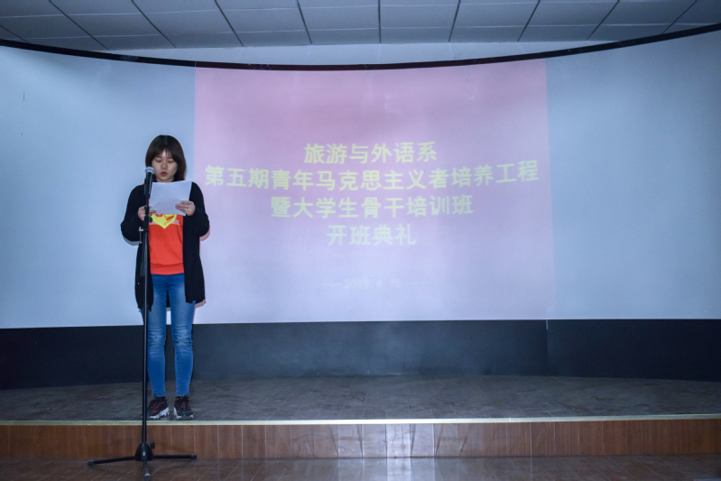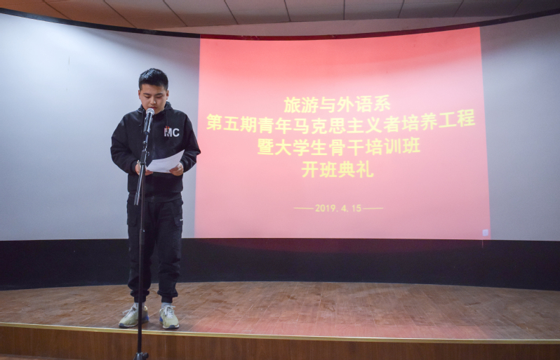 开班典礼由系团总支副书记、副班主任姚浩主持。典礼上,系团总支负责人、班主任陈燕宣读了《关于举办旅游与外语系第五期青年马克思主义者培养工程暨大学生骨干培训班的通知》。系学生会主席、班长孙茂晨在典礼上代表学员发言。