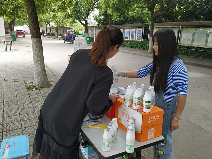 来到学校三号门口的摊位,前来购买商品的学生络绎不绝,参赛选手们大声吆喝:“一瓶娃哈哈,天天好心情,超大的优惠,你不容错过!”同学们被吆喝声吸引前来,询问所选商品价格,该系部2018级网络新闻与传播班的盛王晴热情地向过往同学介绍商品。
