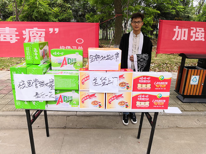与此同时,该系部2018级文秘一班的韩少权也不甘示弱,身着汉服吸引同学的目光,并在摊位上张贴了宣传策略“娃哈哈营销大赛最后一天,全部批发价出售,送货上门,走过路过别错过!”许多同学闻声而来,场面十分热闹。