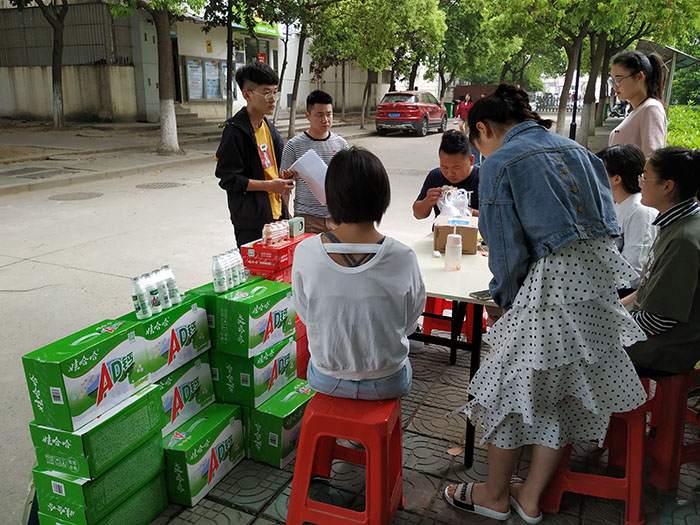 比赛伊始,参赛者们陆陆续续来到食堂门口,三号门门口,主干道摆摊设点开始销售产品。该系部学生会实践部部长陈前带领其部门成员细心为各组参赛者核对产品数量。