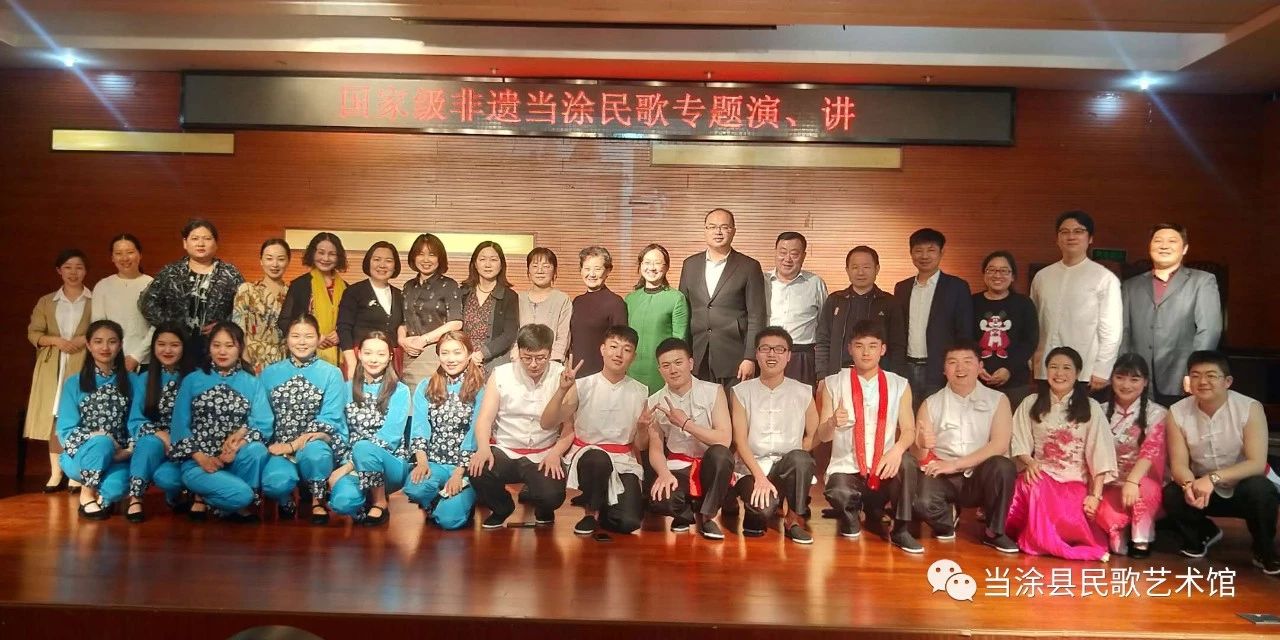专题讲座和演唱会还展示了安徽大学艺术学院师生们的教学成果,演唱了当涂民歌《一把小伞亮铮铮》和《熟透的庄家一片黄》,并与传承人合作演唱了《唱的绿海泛金波》和《打麦歌》这两首当涂民歌经典曲目,将活动推向了高潮。