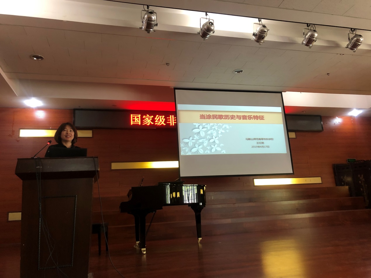 本网讯 国家非遗当涂民歌专题讲座与演唱会于4月17日下午在安徽大学艺术学院艺术楼音乐厅举行。本次活动特邀马鞍山师范高等专科学校的王红艳教授作了题为《当涂民歌历史与音乐特征》的专题讲座,讲座介绍了当涂民歌几千年来传唱不息的文化价值,并对各时期的演变发展过程、音乐特点及形成原因作了详细的论述。