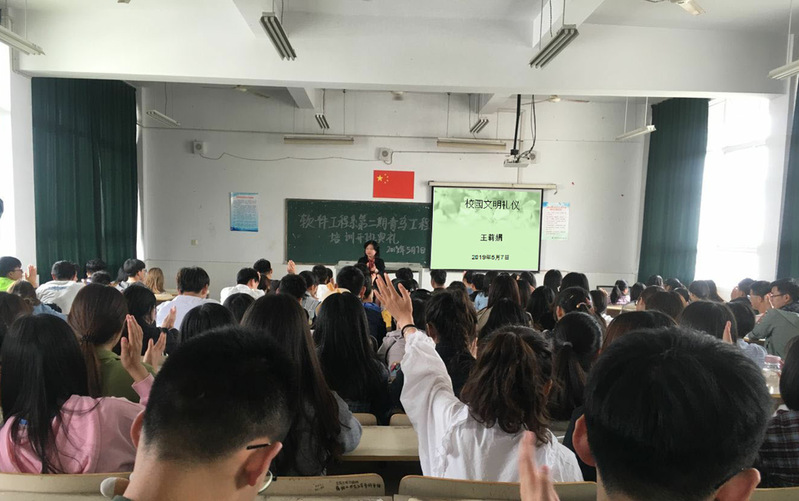 开班典礼结束后,本次培训正式开讲,第一讲由王莉娟书记担任主讲人,主题是《校园文明礼仪》。讲座开始,王莉娟告诉同学们什么是文明礼仪以及文明和礼仪这两者的来源。文明礼仪从小就通过父母和老师的教育贯彻在我们的生活中,但却未真正落实在生活的方方面面,然而作为一名大学生做到讲文明、知礼仪是基本的要求。王莉娟通过个人礼仪、课堂礼仪、集会礼仪、尊师礼仪、同学间的礼仪、校园公共礼仪以及家庭礼仪等七个方面来讲述礼仪知识。在谈起宿舍文明时,王莉娟结合自己当年的宿舍生活谈宿舍文明。当时的生活很艰苦,但她对自身的要求却毫不松懈,每日都整理好床被。宿舍同学也都按时值日,维护宿舍环境。除了日常生活,学习也是大学生的重中之重,尤其在课堂上更需要好的课堂礼仪。王书记的一句话令同学们印象深刻,她说,革命工作需要在哪里,我们学生干部就要在哪里,这就是为人民服务,而作为学生,现在的工作便是学习,那就要好好坚守在自己的岗位上。逃课、迟到、早退都是没有课堂礼仪和尊师礼仪的体现,所以同学们要杜绝这种行为的发生,做一名合格的学生。最后,王莉娟对同学们提出要求和希望,她希望同学们做一名讲文明、懂礼貌、知礼仪、勤奋好学、知行合一的新时代有为青年。同学们纷纷举手表态,做出承诺。