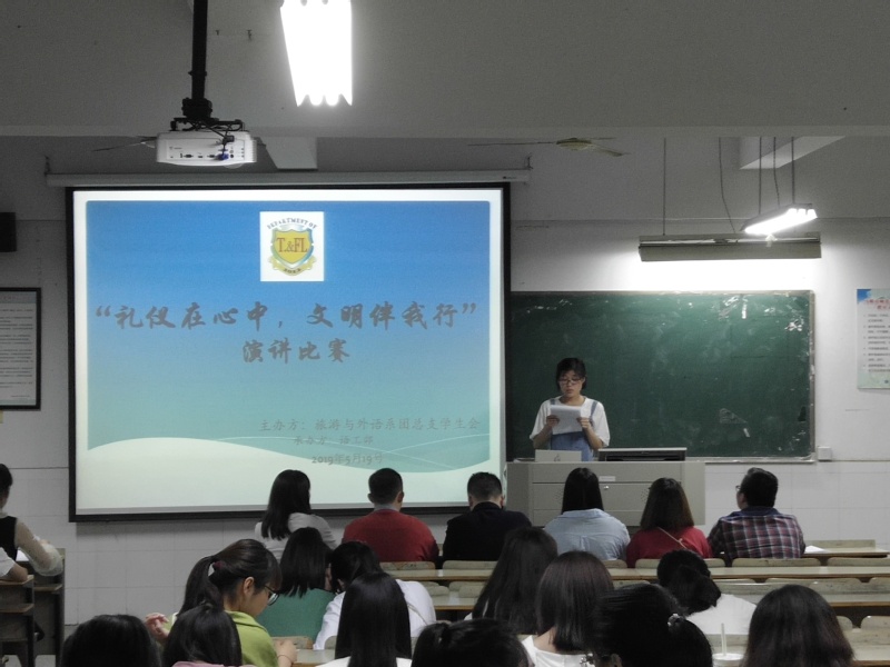 本网讯 为倡导文明行为,提高学生的文明素养,构建文明和谐校园,旅外系团总支于5月19日晚在D307开展了“礼仪在我心,文明伴我行”主题演讲比赛。系团总支副书记姚浩、学生会主席孙茂晨、学生会副主席薛鹏等出席本次比赛并担任评委。