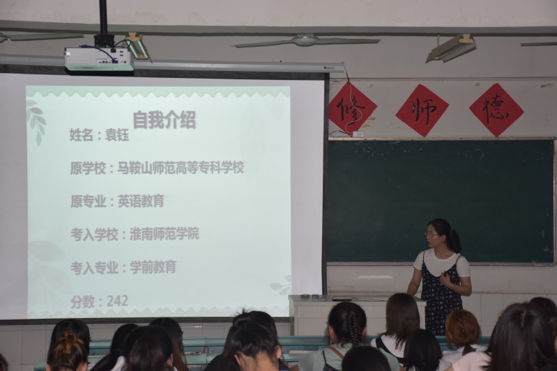 来自2016级英语教育(2)班的袁钰和语文教育(1)班的周冬青是专升本毕业生代表,她们分别成功考入了淮南师范学院学前教育专业和巢湖学院汉语言文学专业。袁钰在交流中表示,自己选择专升本的目的是希望不断完善、提升自己。专升本的道路并不简单,关键是你要明白自己到底要做什么?想要成为什么样的人?对自己的人生需要有个合理的规划。周冬青结合个人备考经验,和学弟学妹们分享了如何确定报考专业,选择报考学校,以及如何处理焦虑和复习规划等问题。早睡早起,注意饮食;管理情绪,调节心态;关注自我,做好规划;自觉自律,稳步发展。这是她们留给学弟学妹们最朴实的建议。