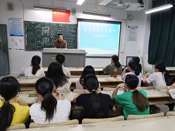 晚7时许,各班班会正式开始。首先进入该系2018级移动商务(2)班,该班班长段彬彬正在为同学们讲解着夏季宿舍用电的基本常识,他结合黑板报的有关内容,针对宿舍常用的电器设施的使用问题做了一一说明,同时也告诫班级同学要遵守宿舍安全用电的规章制度,禁止使用大功率电器,共同维护大家的生命财产安全。