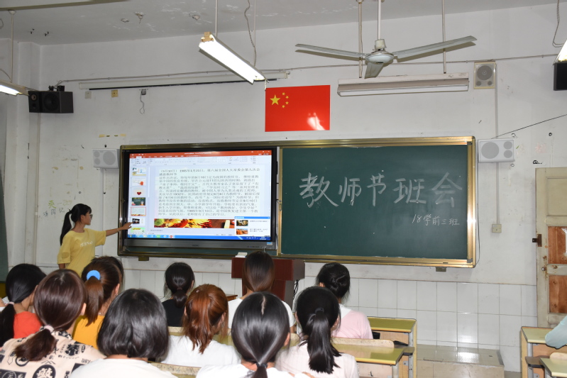 “默默无闻奉献智慧,孜孜不倦耕耘心田”。2018级学前教育三班的班会负责人正在详细地为大家介绍教师节的由来和相关典故。同时,他还结合古往今来圣贤、伟人敬师的小故事,带领同学们了解我国“尊师重道”的传统美德,让同学们不仅深念教师之恩,更为自己选择教师教育专业,将来能够做一名人民教师而感到无上荣光。桃李满天下,九月谢师恩。2018级小学教育的同学们对于教师节的到来表现的更为活跃,他们作为全科小学教育定向委培生,自己的职业早已和教师岗位紧密相连。活动中,同学们积极主动地到讲台上讲述着自己与恩师之间的点点滴滴,精彩的发言赢得了阵阵掌声。其实他们所描述的不仅仅是自己的故事,更是万千师生之间最真挚的情谊与情感。