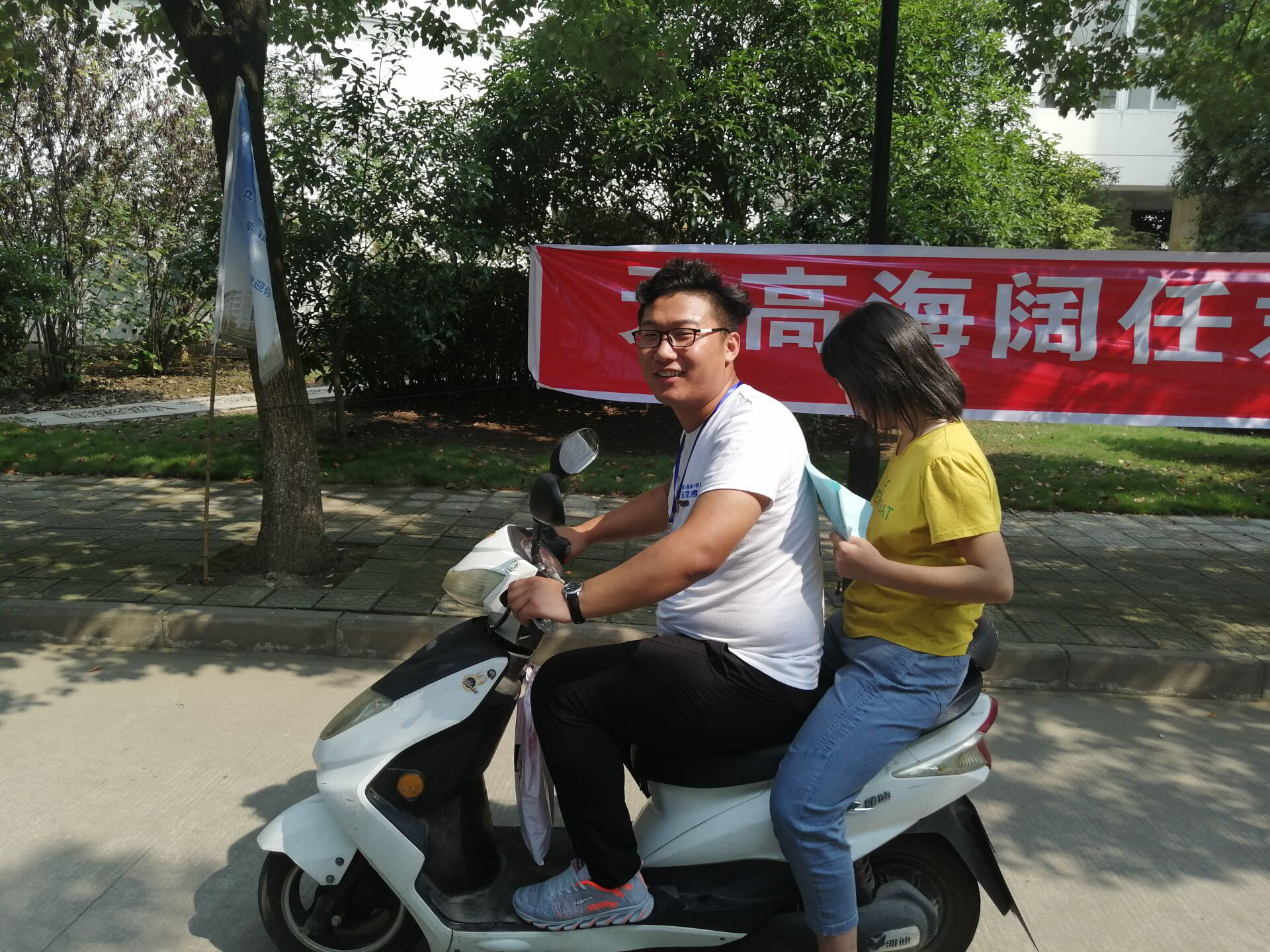 遇到独自一人来报道的小学妹,骑着电瓶车的学长不忘顺便载她一程,帮助其快速到达指定点。