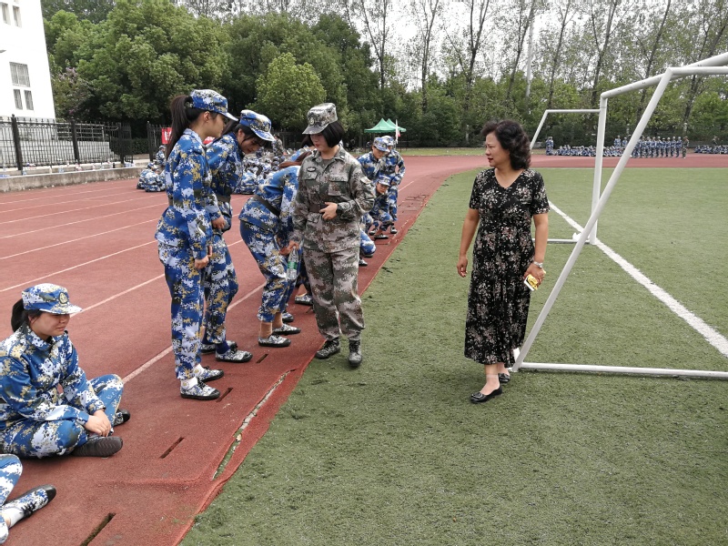 王莉娟书记走到同学们当中,看望正在军训的同学们,为军训的同学们加油鼓劲,她希望新生们都能认真训练,磨练意志,高标准高质量的完成训练任务。