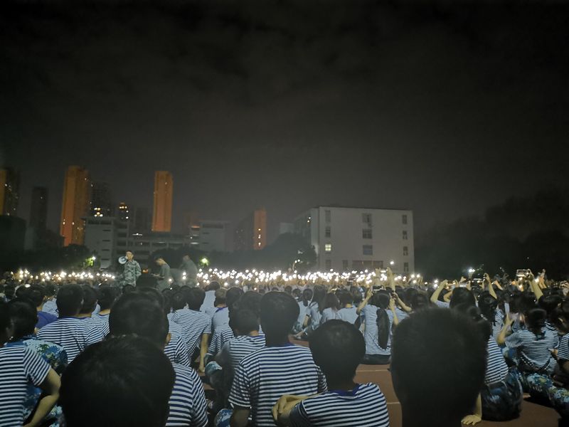 本网讯 今天是军训的第六天。明月当空、夜风微凉,同学们身着蓝白条纹的海魂衫迷彩训练裤,怀着激动的心情踏入操场,因为学校通知今晚有拉歌活动。