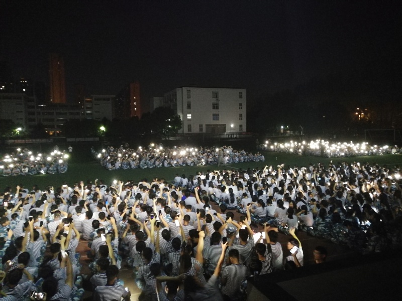 各个方队由教官指挥着站队。我们是五营,被安排在了操场主席台下的黄金位置,纵观四方,一览无余。今晚的教官与白天的教官似乎有些不同,带着些许妩媚,更有女人味了。她们挺拔的身姿,矗立在操场成为一道靓丽的风景线。教官们拿着喇叭,拿着“小蜜蜂”引导着我们进行拉歌。这其中的气氛无以言喻。我们大声,我们用情,我们用我们的高分贝唱着军歌。我们体会,我们经历,我们留恋,我们会永远记住今晚。全场同学打开手机的电筒功能,不停的晃动着,操场上瞬间点点“星光”簇拥着,成为了全校最美的风景。