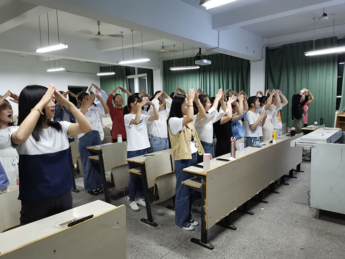 “我和我的祖国,一刻也不能分割,无论我走到哪里,都流出一首赞歌…”熟悉的旋律响起,同学们动听的唱出来,娓娓道来的一个故事,关于这个国家的故事。美妙的歌曲配合上美丽的手势,歌曲里面加入手势舞的因素,生动的诠释了同学们的爱国之情。由于同学们的音域,音调各不相同,在自由休息时间,一部分同学们聚集在一起,讨论一些发不准的音,互相学习,互相进步,不知不觉中同学们的凝聚力得到了增强。