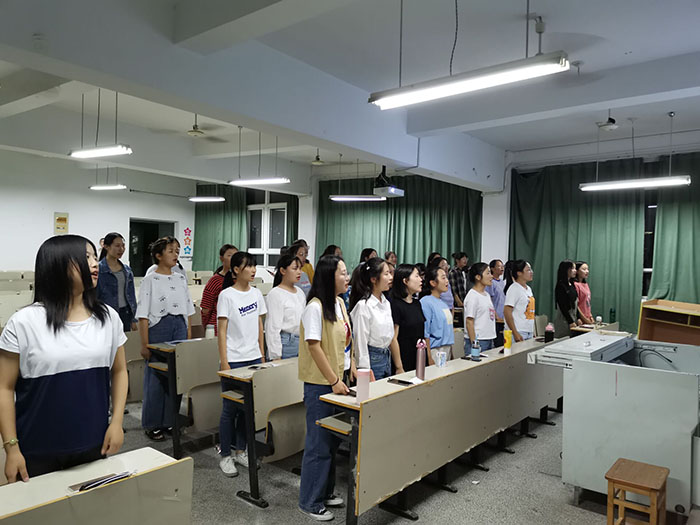 本网讯 为了备战校团委举办的庆祝建国七十周年大合唱比赛,经济与社会管理系(思政部)团总支积极组织该系部2019级新生于博学楼E306进行排练。