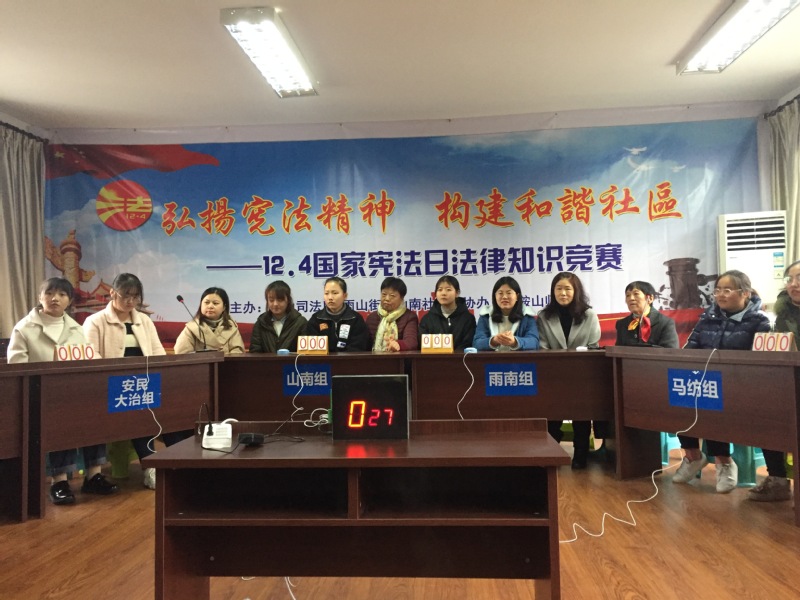 本网讯 为迎接12月4日全国法制宣传日,弘扬社会主义法治理念和法治精神,11月27日,由雨山区司法所、雨山街道山南社区主办,马鞍山师专教师教育系协办开展的以“弘扬宪法精神,构建和谐社区”为主题的宪法知识竞赛活动在山南社区会议室举办。教师教育系(基础部)党总支负责人、副书记吴德琴带领学生代表参加。